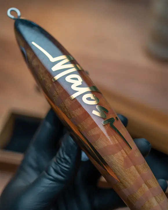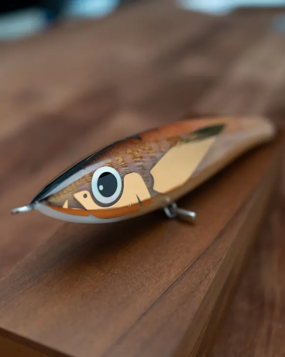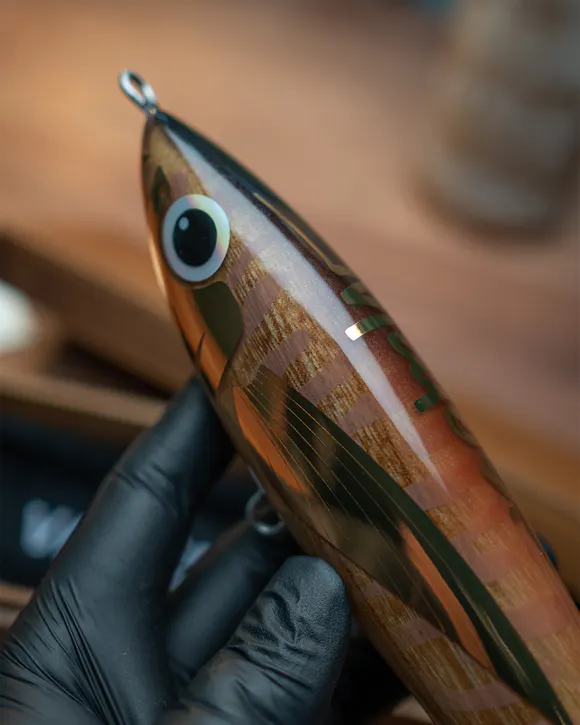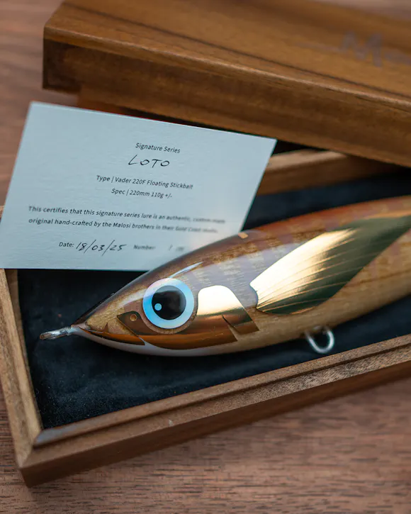 Loto With wood at the heart of our Signature Series lure, we set out to highlight its natural beauty in every detail. The ‘Loto’ was crafted to let the wood shine first and foremost. Featuring our signature pattern design, we’ve carefully selected a paint and decal palette that enhances and complements the raw, organic character of the timber. The ‘Loto’ is a true tribute to the unique strength and beauty of natural wood. The Vader 220F The Vader is more traditional in design featuring a single, carefully balanced rear weight and a buoyant timber body assembled in two halves. Experienced anglers will appreciate the responsiveness and range of different finesse actions this floating stickbait can perform; from straight retrieve, reverse jig and stabbing jerk, to long soft sweeps, the Vader can produce some seriously alluring S action, surface splashing, and dense bubble trails as it dives.
